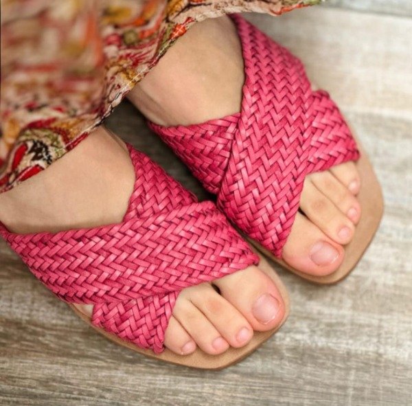 La sandalia Malva es pura expresión visual: su capellada en cruz de ratán trenzado aporta textura artesanal, mientras que su paleta vibrante y colorida encarna el espíritu libre y ecléctico de la colección.
